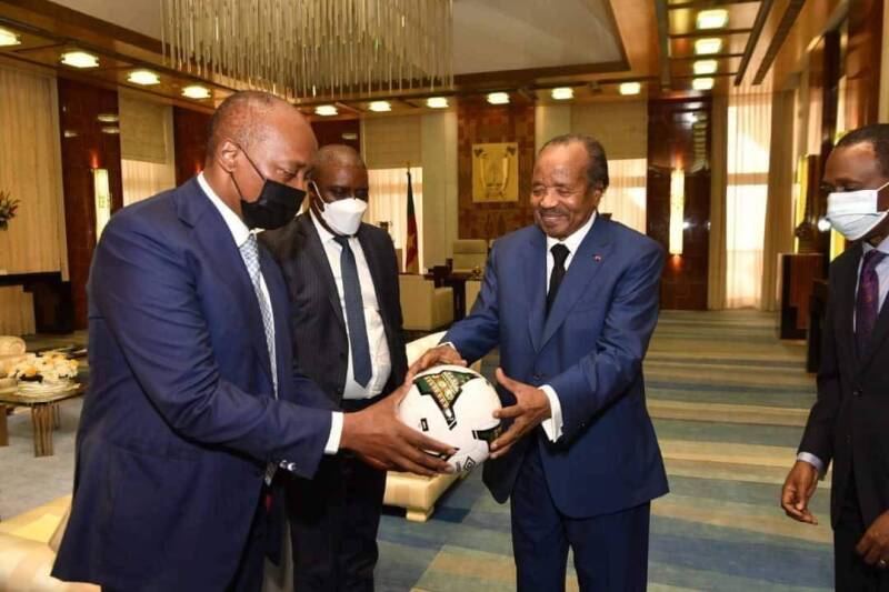 LE CAPITAINE DU TONNERRE STEPHEN TATAW PRESENTE AU CHEF DE L'ETAT PAUL BIYA SES COEQUIPIERS DONC JO FARGEON A LA FINALE DE LA COUPE DU CAMEROUN